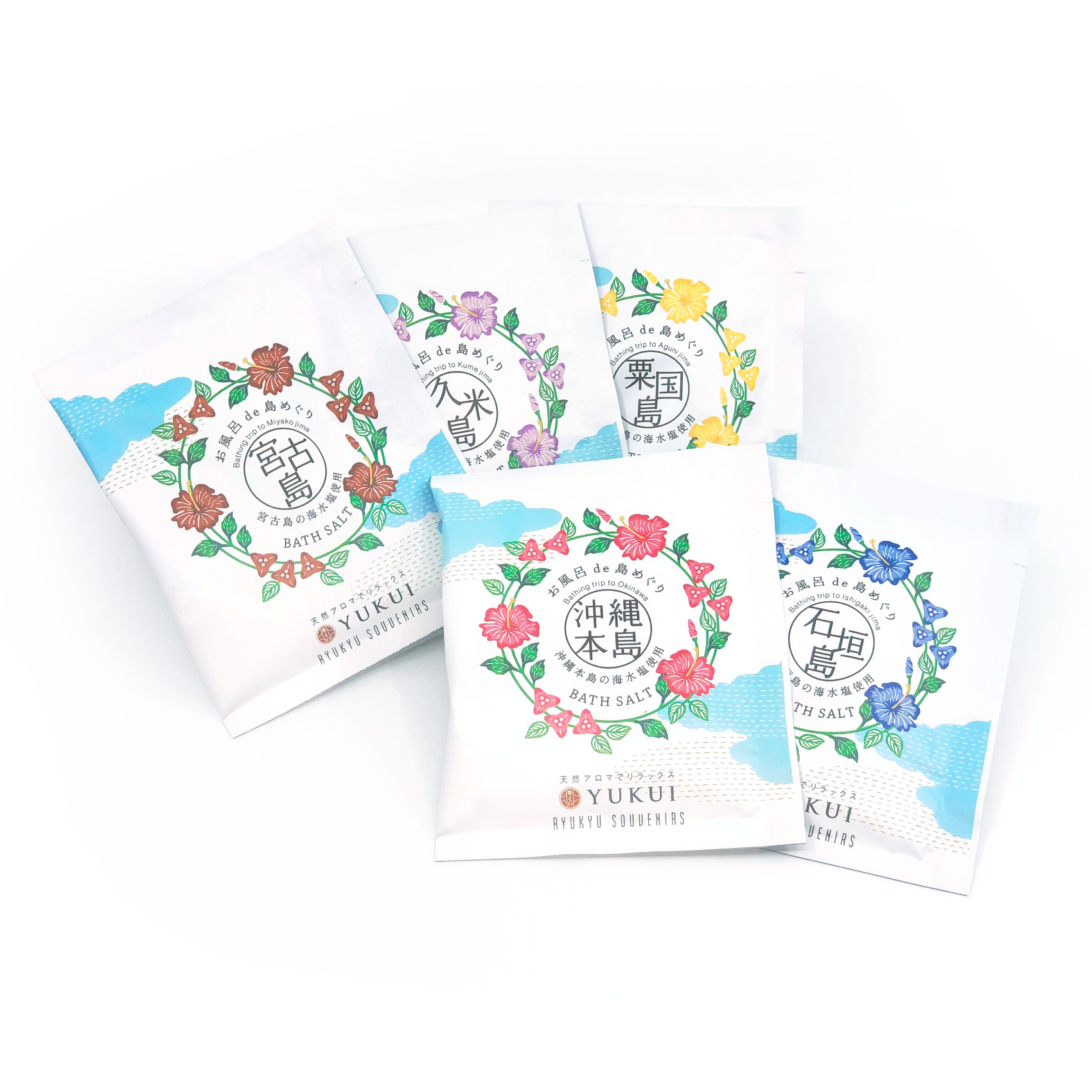 沖縄の島々の海から作られた海水塩を配合し、香り付け・色付けにも天然成分を使用したナチュラルな入浴剤です。ご家庭や旅先のお風呂で、沖縄の5つの島々の海を感じながら、島めぐりするようにリゾート気分でバスタイムを楽しんでいただけます。